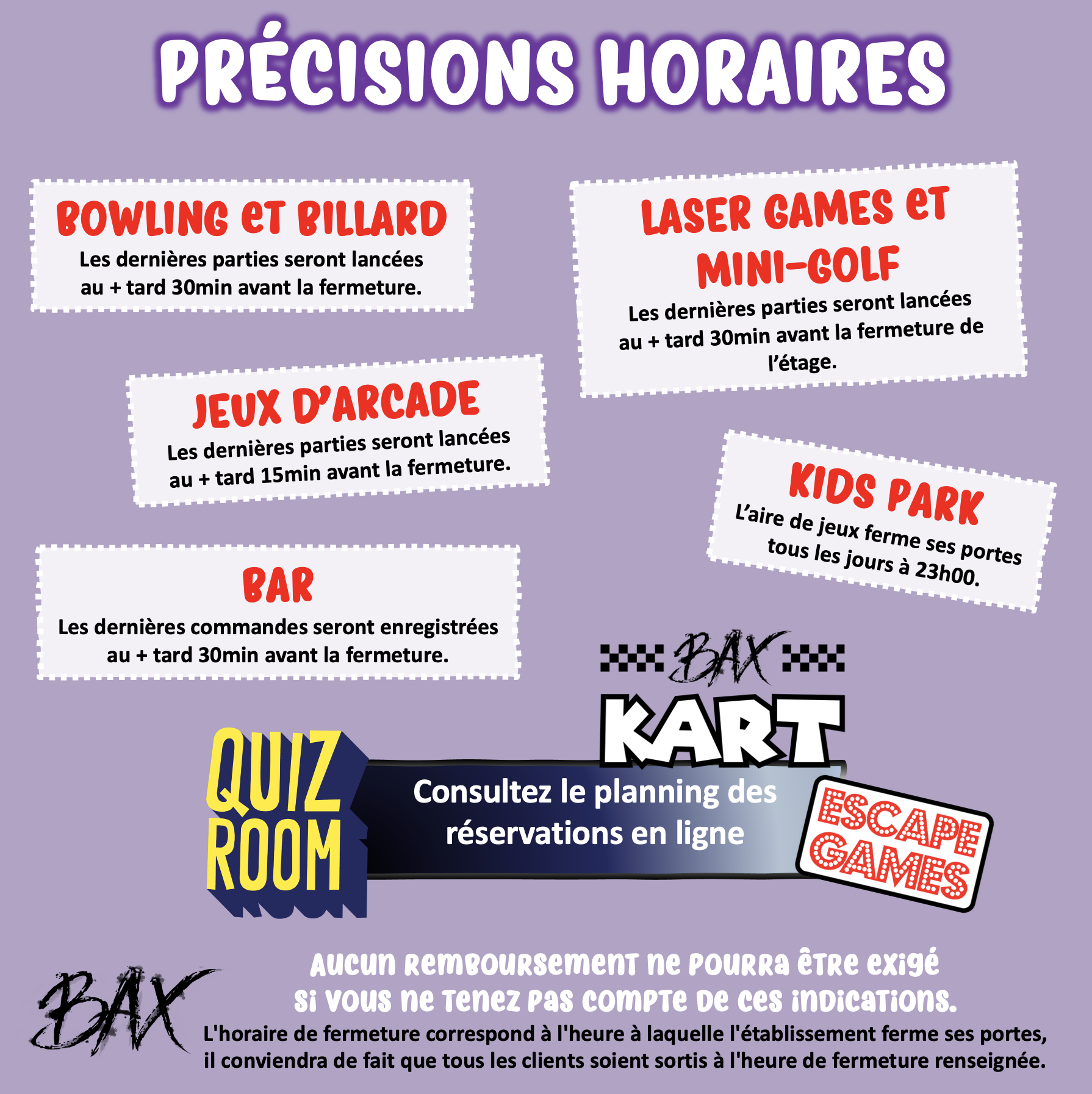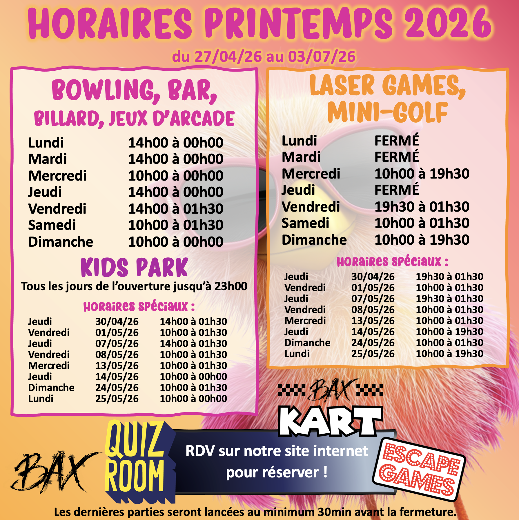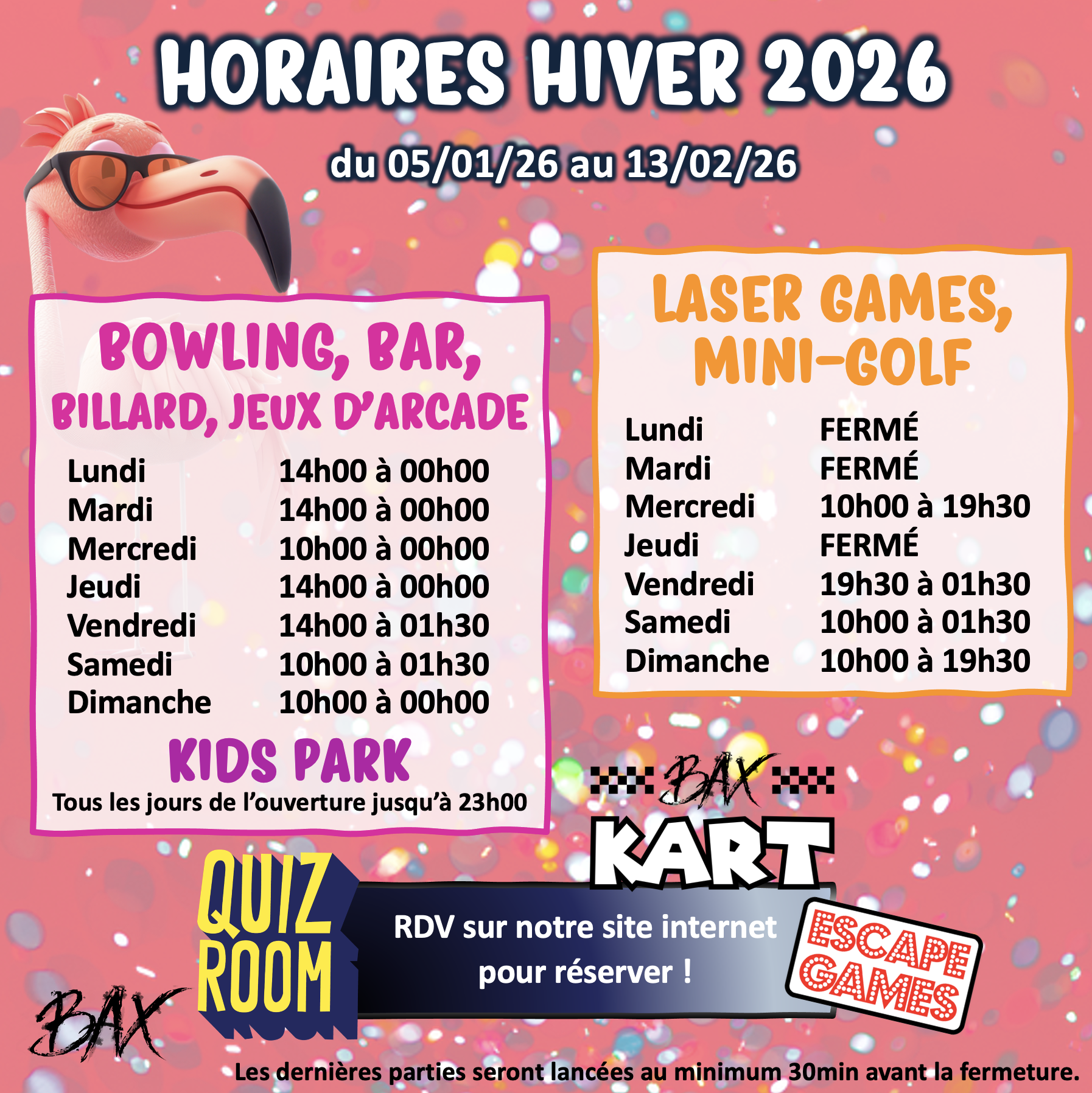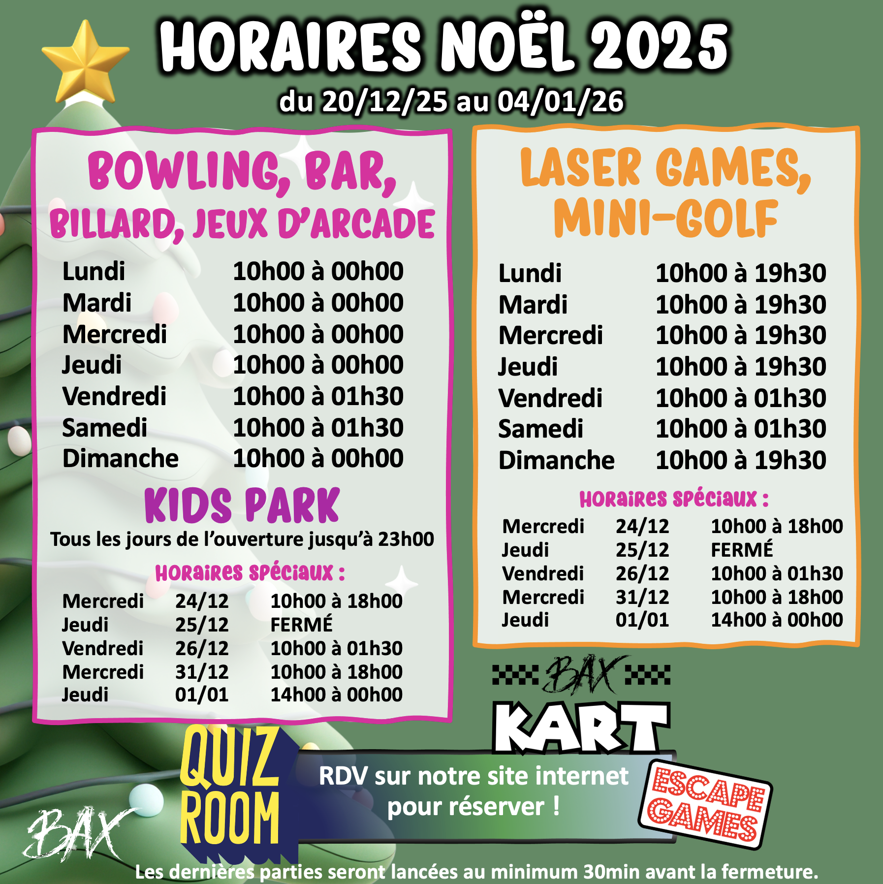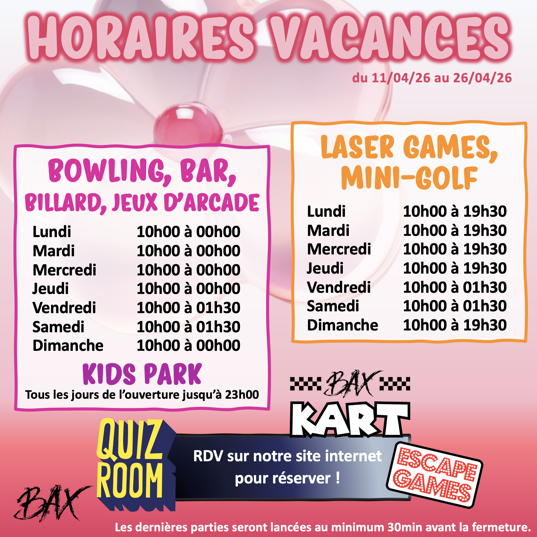 Dernières parties env. 30 minutes avant la fermeture.
